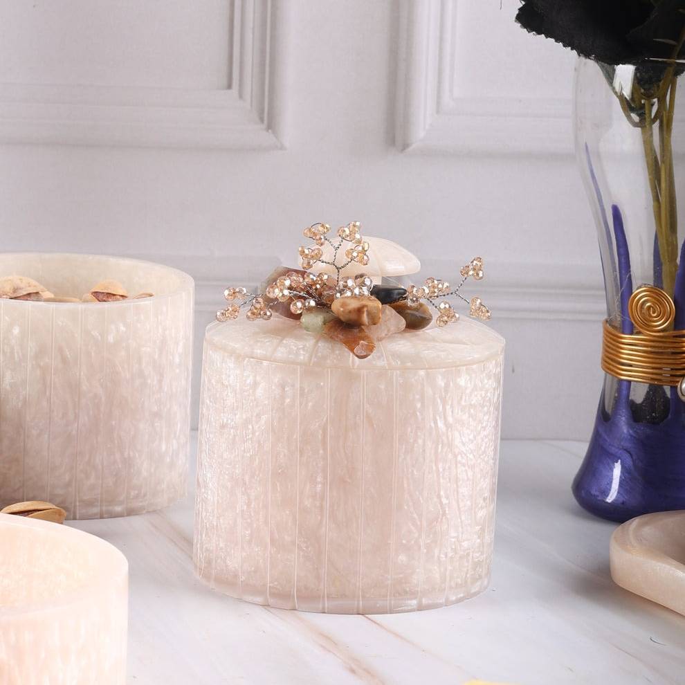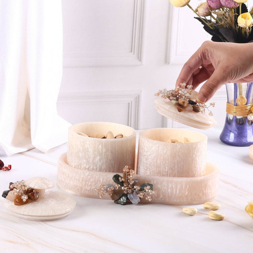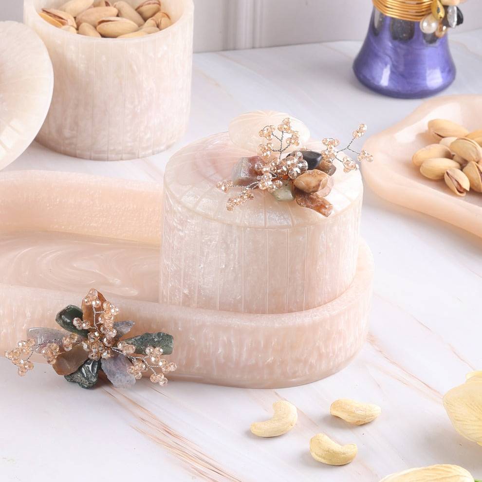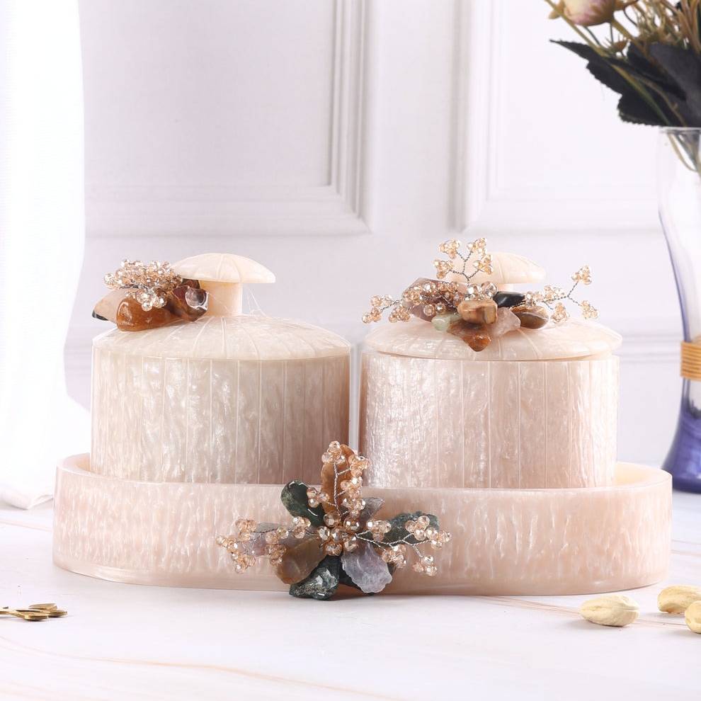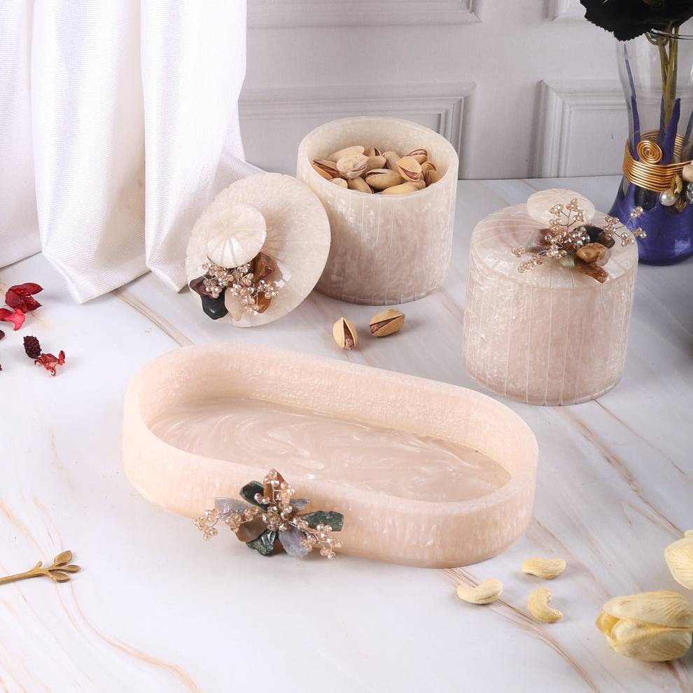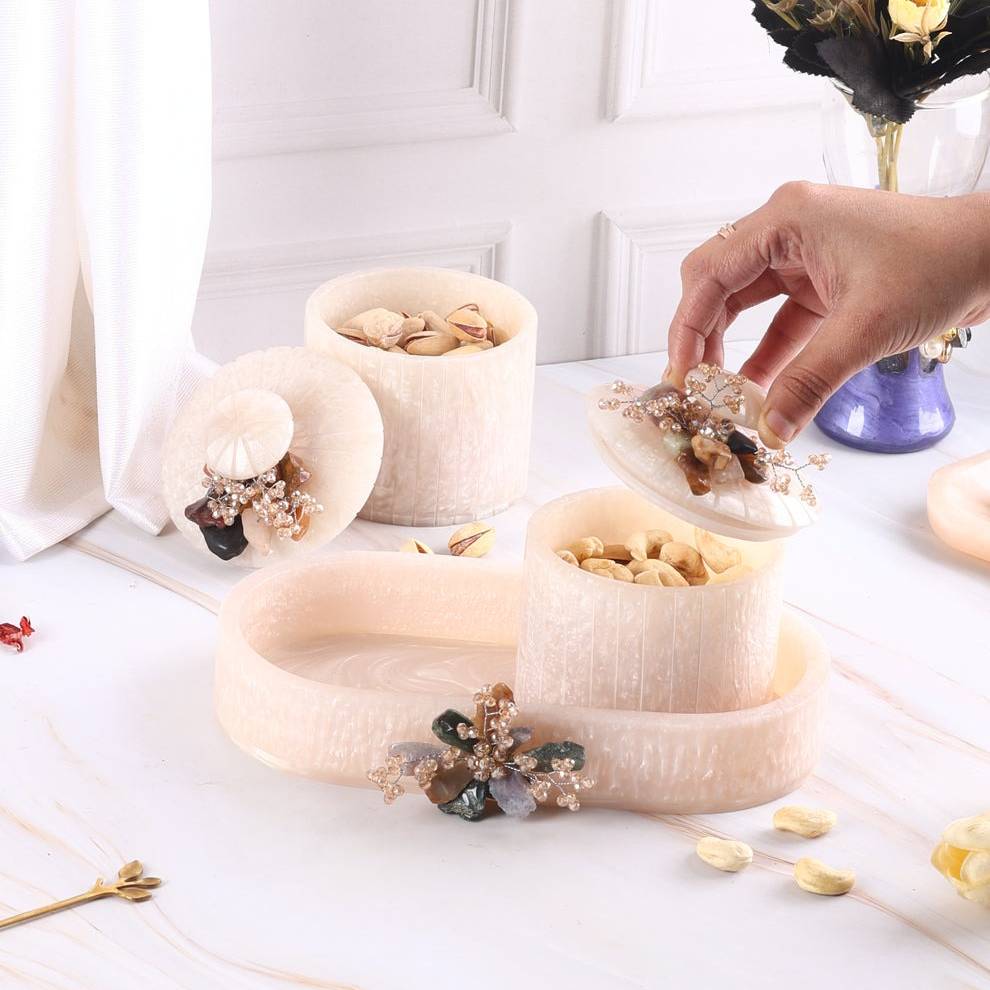 Tray: Premium Resin (handcrafted) Jars: Airtight Glass (food-safe, durable)