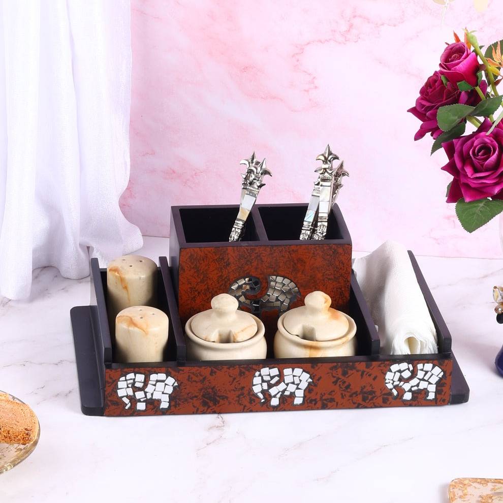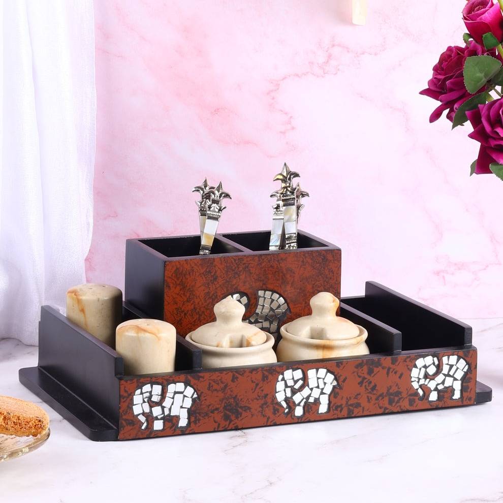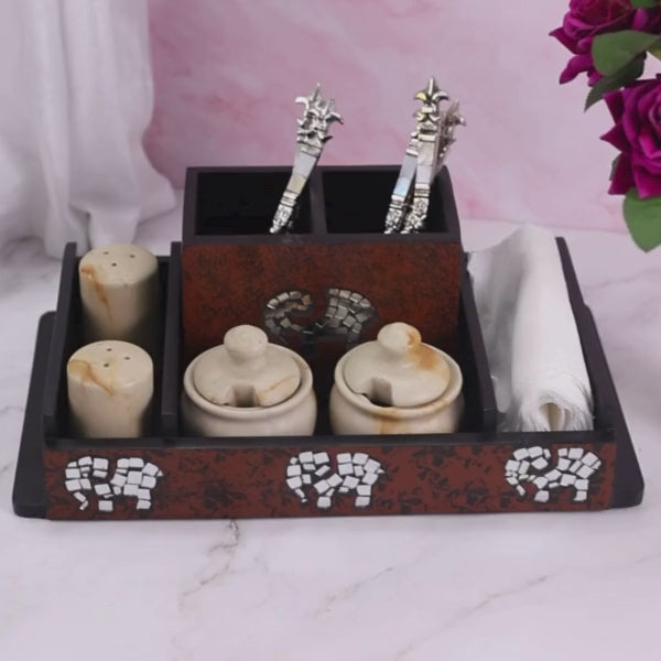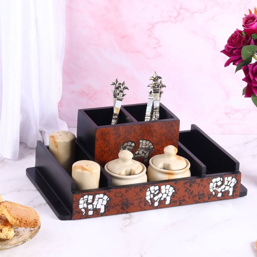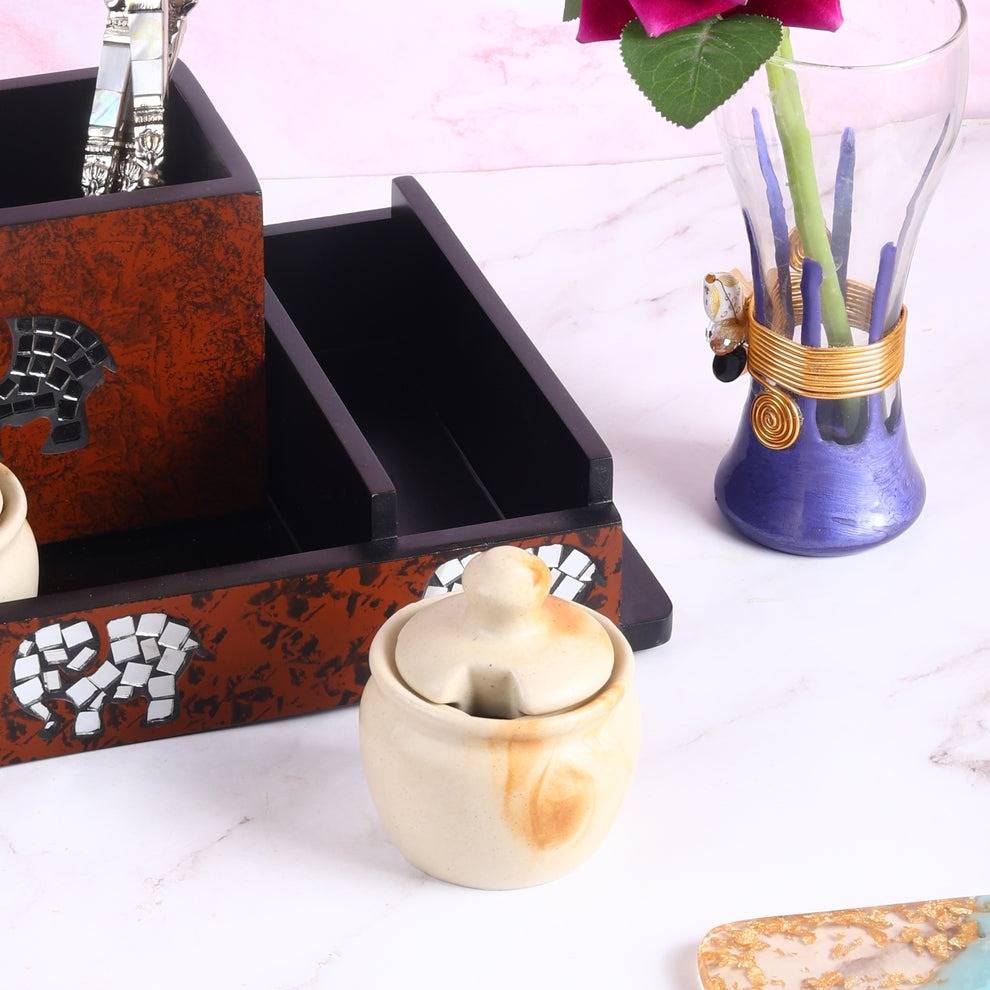 Enhance your dining and serving style with the Matki Organiser Set by Sajjakreation. This set includes 2 brown matki-shaped containers with matching spoons, 2 salt & pepper shakers, and a sturdy MDF holder to keep everything organized.