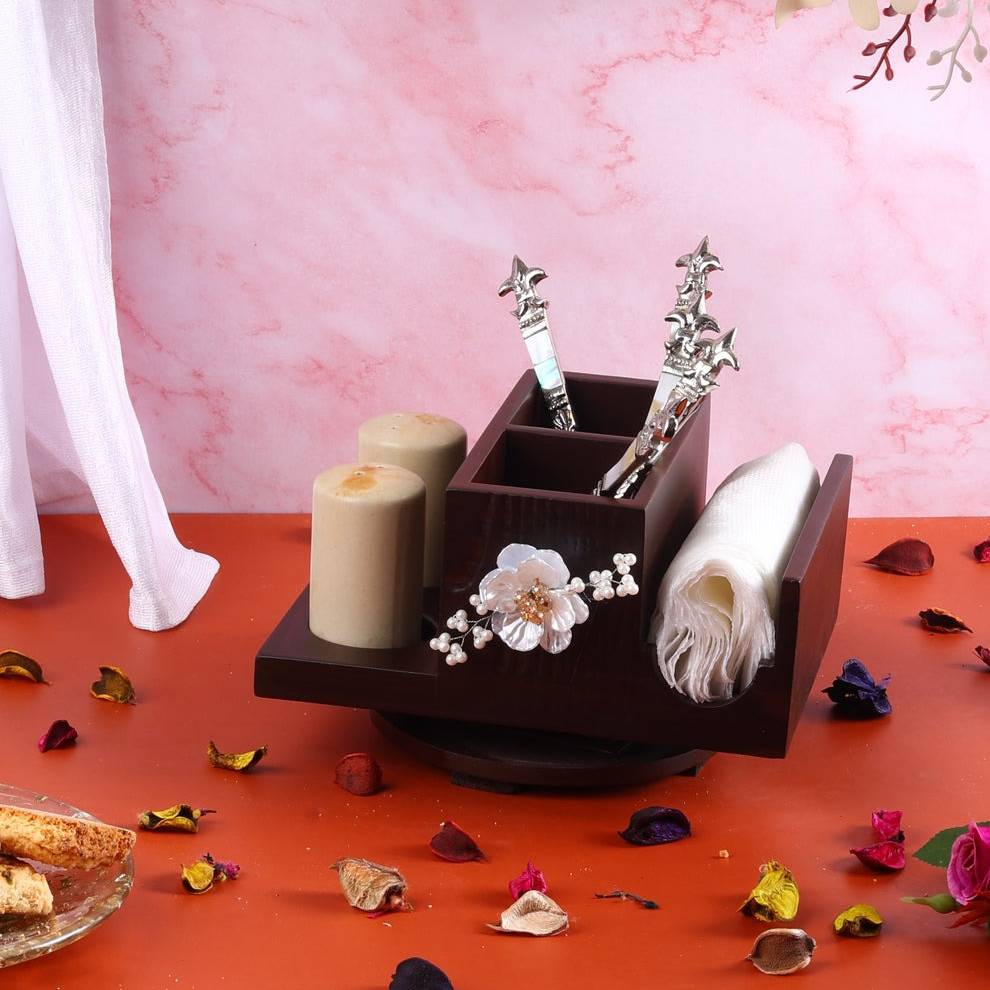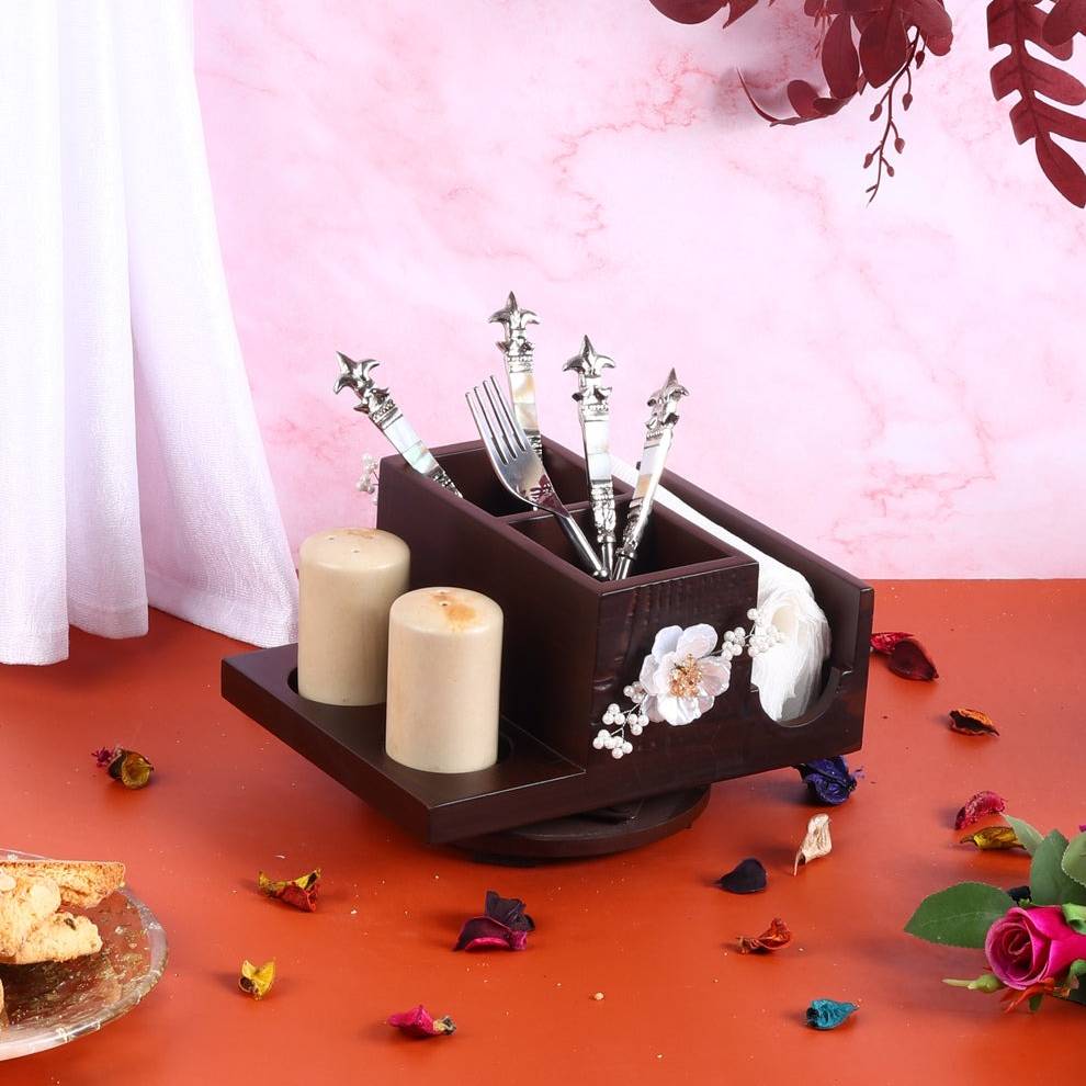 Elevate your dining experience with the Wooden Revolving Dining Organizer from Sajjakreation. Designed with a smooth wooden revolving base and double-sided beautiful motif, this organizer combines style with everyday practicality. It includes two finely crafted porcelain salt and pepper shakers, ensuring convenience and sophistication at your dining table. Compact yet functional, it’s the perfect centerpiece for organized dining.