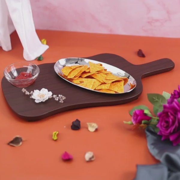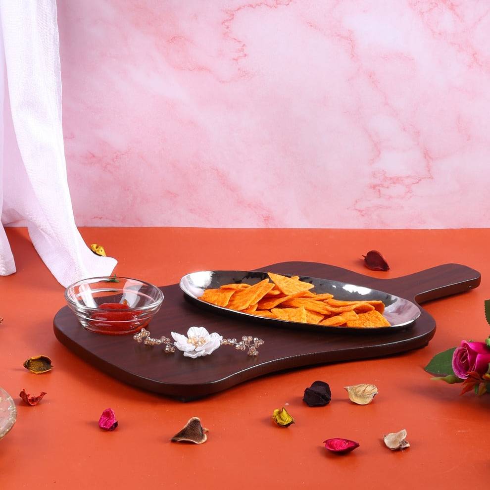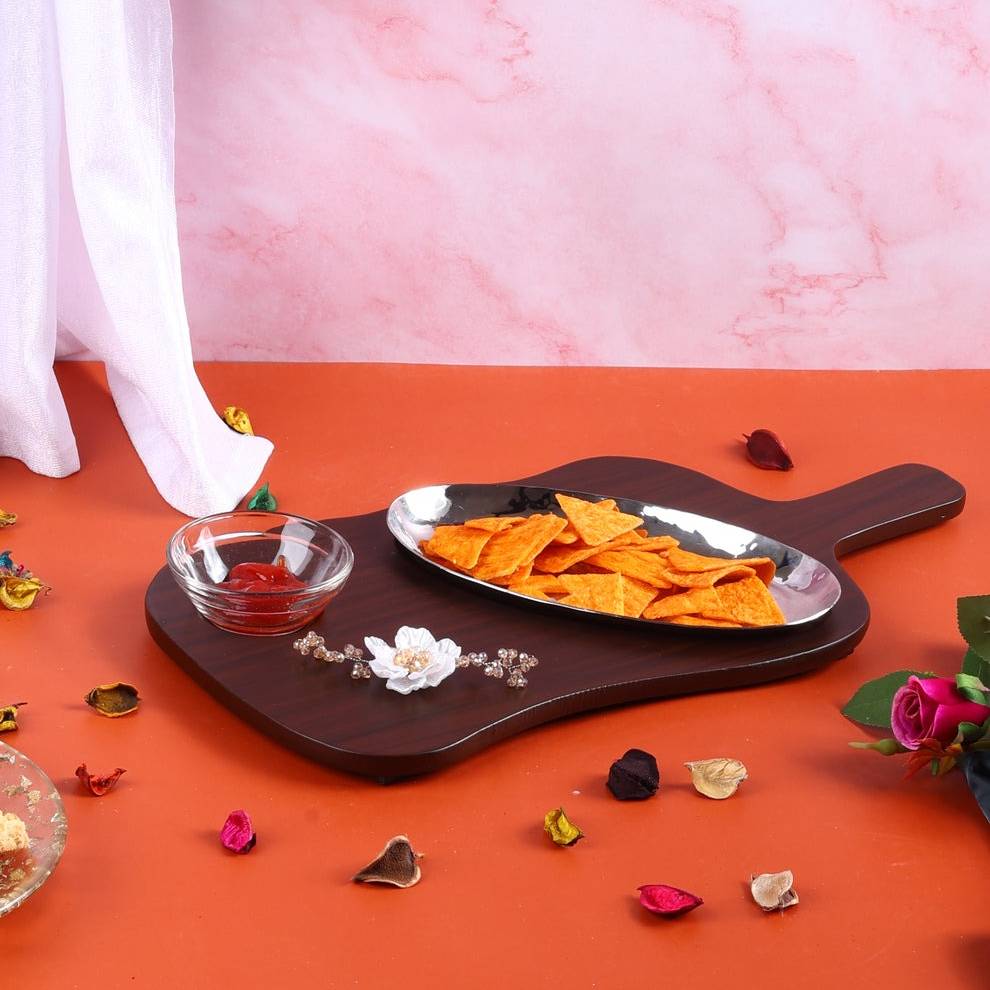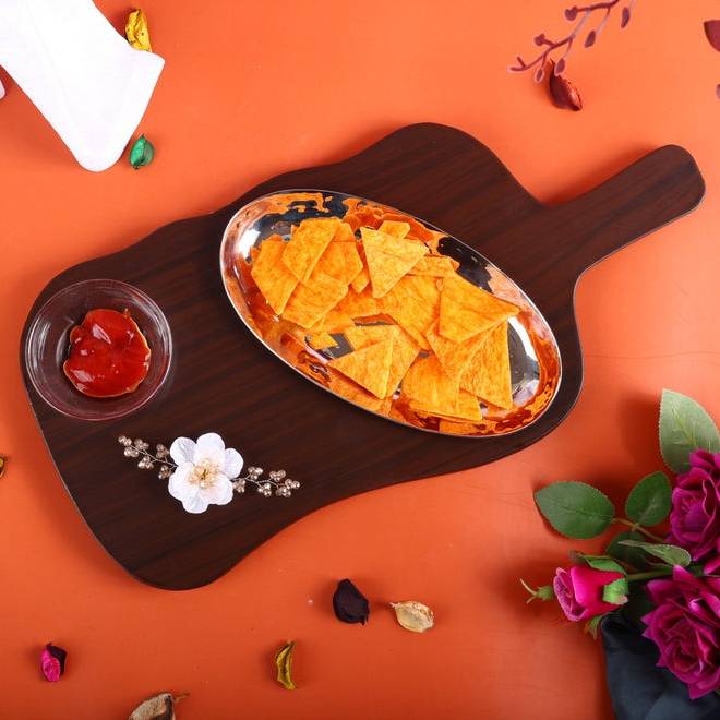 • Wooden base for a premium, natural look • Steel plate for durability and easy serving • Glass dip bowl for sauces, chutneys, and dips • Perfect for family dinners, parties, and cafés • Smart size for compact tabletops