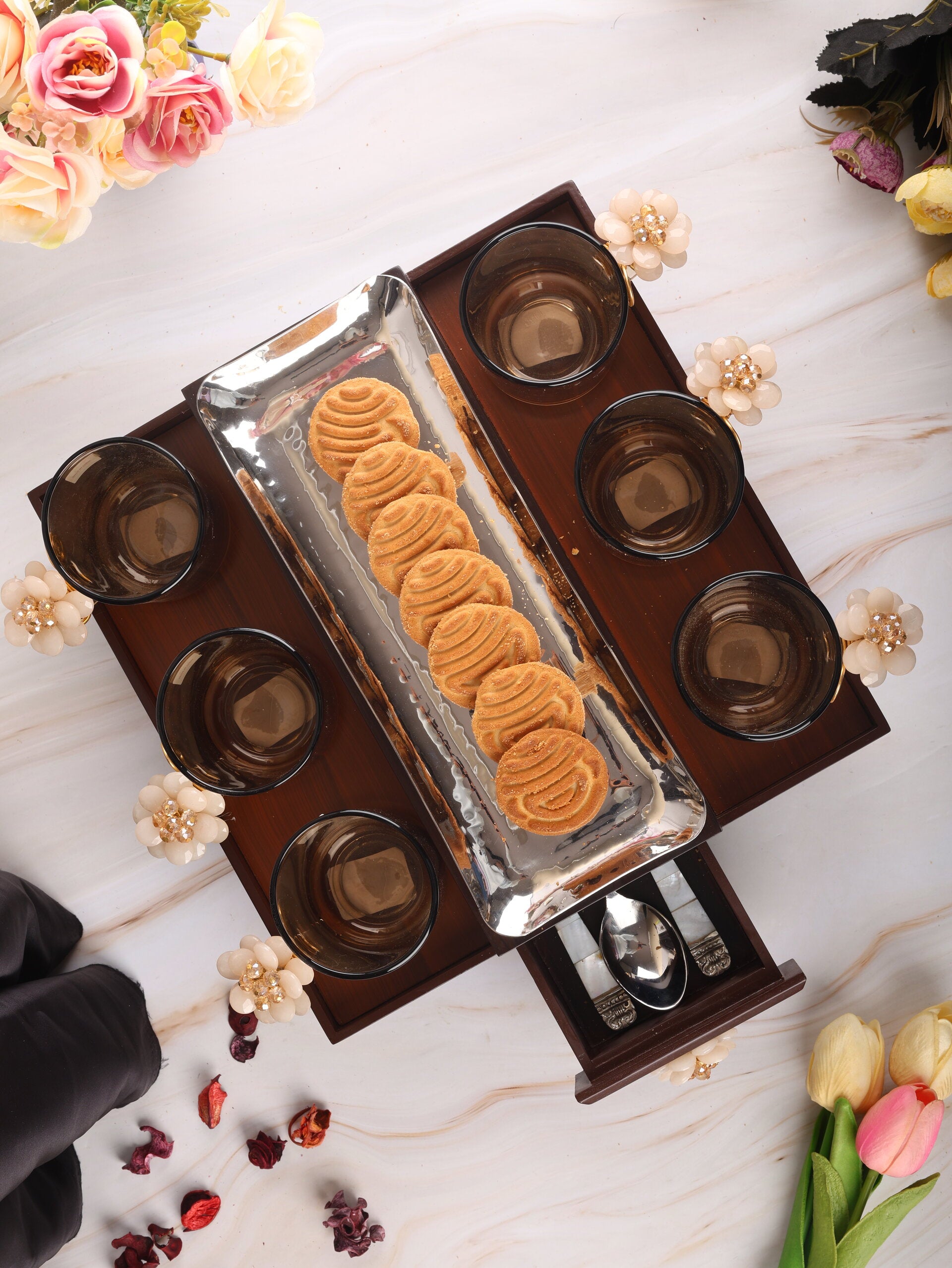 Add a warm and natural touch to your home with the Handmade Wooden Serving Tray with Utensils by Sajjakreation. This tray is made from sturdy wood and crafted carefully by skilled hands. It comes with matching utensils, so you have everything you need for easy serving.