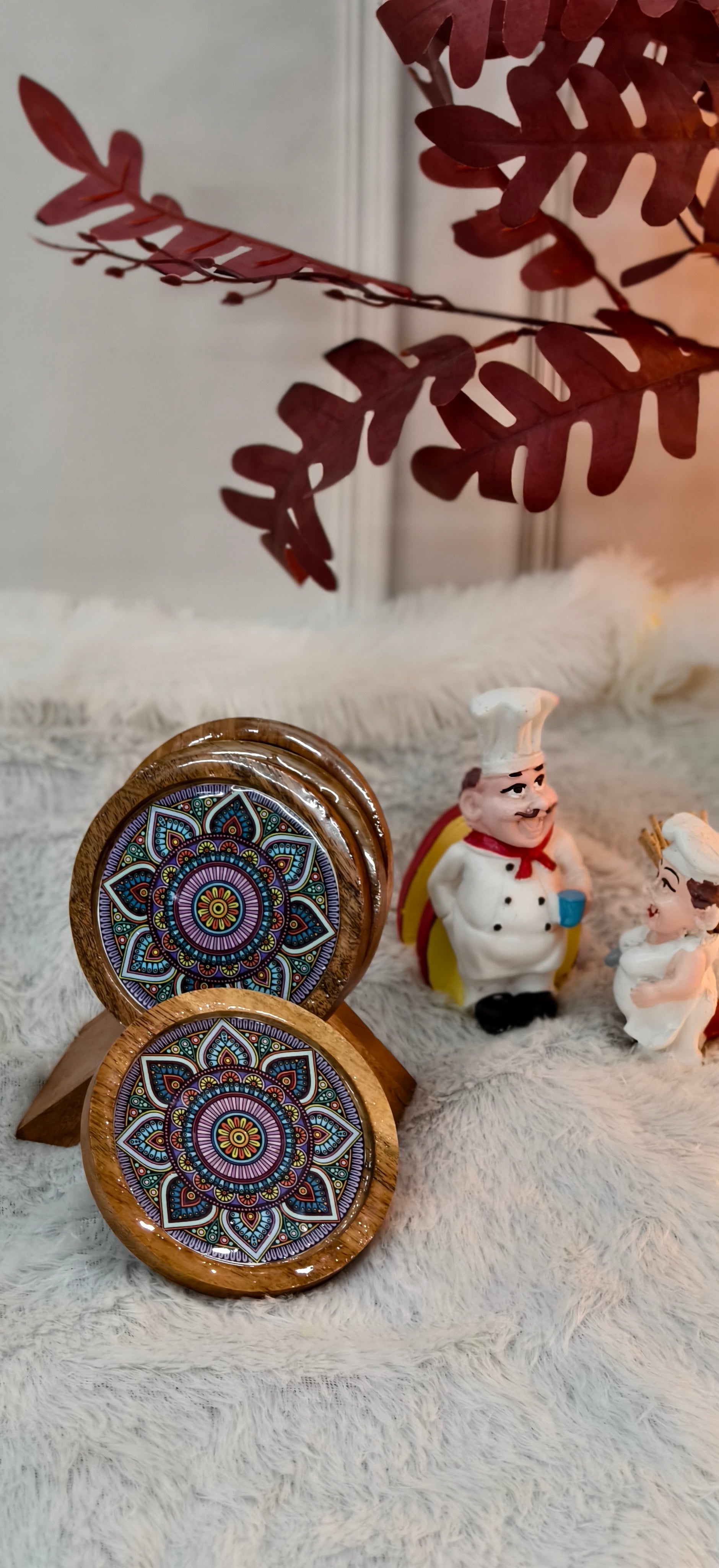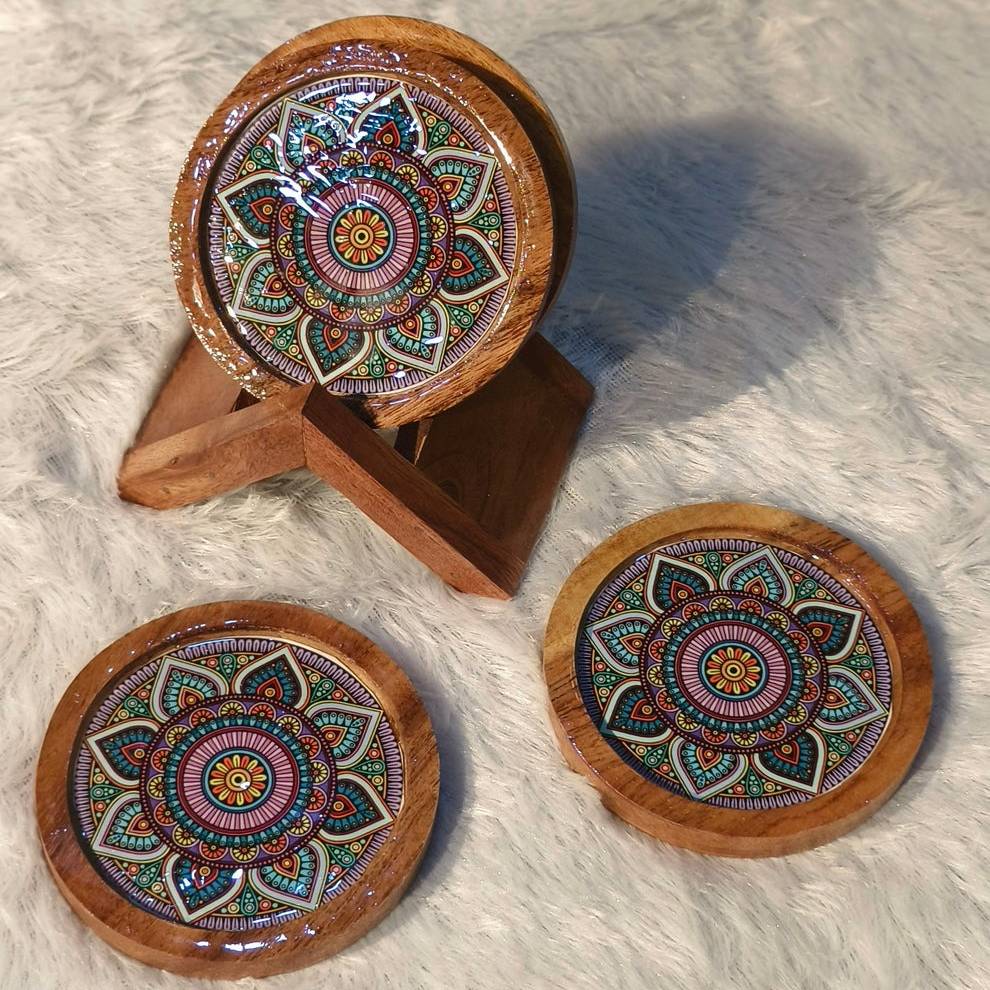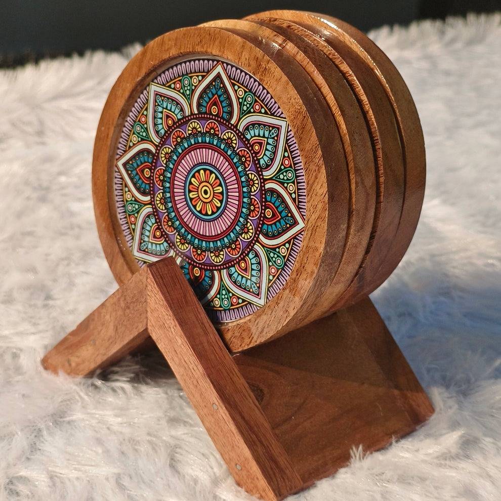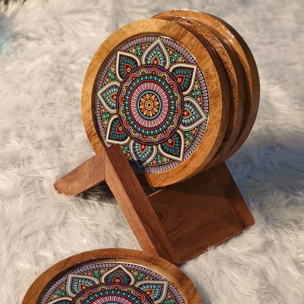 "Protect your surfaces with our Wooden Coaster set of 4. Made of high-quality wood, these coasters add a touch of elegance to any room. The included holder keeps them organized and easily accessible. Keep your surfaces safe in style."